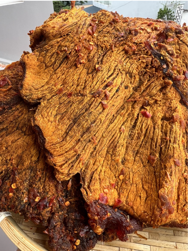 - Đặc điểm: Thịt nguyên tảng được lấy từ phần đùi của con bò, bên ngoài sấy khô nhưng khi xé ra sẽ cảm nhận được độ ẩm bên trong các thớ thịt.